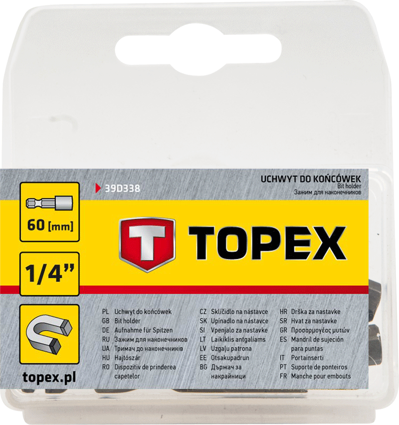 Uchwyt do końcówek TOPEX (nr ref. 39D338) o długości 60 mm przeznaczony do wkrętarek i wiertarko-wkrętarek z końcówką w rozmiarze 1/4 . Umożliwia szybką i prostą wymianę bitów. Marka TOPEX skierowana jest do majsterkowiczów.