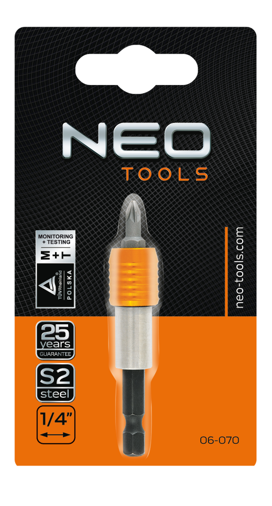 Uchwyt do końcówek 1/4" NEO (nr ref. 06-070) o długości 65 mm, magnetyczny. Z końcówką wkrętakową PH2 x 25 mm. Wykonany jest z wytrzymałej stali chromowo-wanadowej. Jakość narzędzia potwierdzona certyfikatem T V i 25-letnią gwarancją producenta. Marka NE