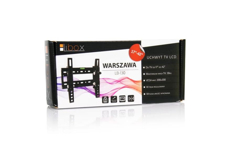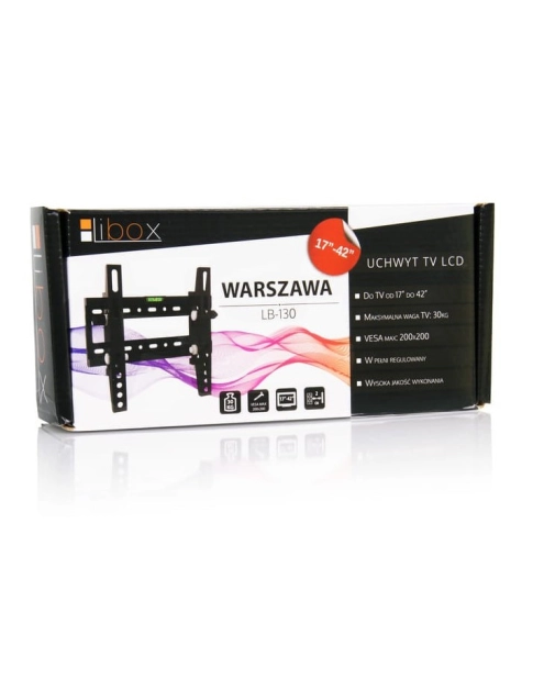 Uchwyt LCD WARSZAWA LB-130 LIBOX to solidne rozwiązanie montażowe dedykowane do telewizorów o przekątnej od 17 do 42 cali, z możliwością montażu większych ekranów. Dzięki maksymalnemu udźwigowi do 30 kg, uchwyt zapewnia bezpieczne i stabilne mocowanie telewizora. Uchwyt oferuje regulację nachylenia w zakresie +10° / -10°, co umożliwia dostosowanie kąta widzenia do indywidualnych preferencji. Odstęp od ściany wynoszący 56 mm nadaje instalacji estetyczny i schludny wygląd, idealny do nowoczesnych wnętrz. Grube, wzmocnione stalowe profile oraz tuleje wykonane z ABS zapewniają wysoką wytrzymałość i ochronę przed opadaniem. Szeroka podstawa montażowa oraz poziomica w zestawie ułatwiają precyzyjny i łatwy montaż. Uchwyt spełnia normy jakości, posiadając certyfikaty ISO i TUV GS, co gwarantuje bezpieczeństwo i niezawodność. Produkt jest zgodny ze standardem VESA w zakresie od 75x75 do 200x200 mm, co czyni go uniwersalnym i kompatybilnym z wieloma telewizorami. W zestawie znajduje się komplet śrub montażowych, wkrętów oraz kołków do ściany, co pozwala na szybki i bezproblemowy montaż.