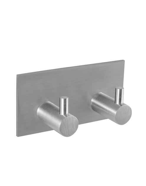 Podwójny wieszak ścienny wykonany ze stali nierdzewnej. Montowany jest do ściany w łatwy sposób, bez użycia gwoździ za pomocą taśmy 3M.
