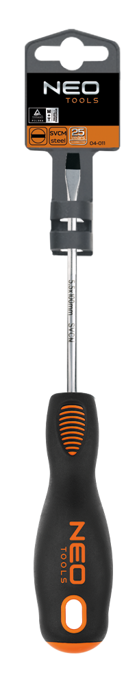 Wkrętak płaski NEO (nr ref. 04-011) o wymiarach 3.0 x 75 mm. Grot wkrętaka wykonany jest z wyjątkowo wytrzymałej stali S2. Końcówka robocza grota została poddana obróbce cieplnej, dzięki czemu uzyskano odpowiednią twardość i odporność na zgięcia 56 HRC. Wkrętak posiada magnetyczną końcówkę. Trójgraniasty kształt uchwytu z wyprofilowanym oparciem dla kciuka zmniejsza obciążenie dłoni podczas pracy i ułatwia uzyskanie optymalnego momentu obrotowego. Dwumateriałowy uchwyt zapobiega ślizganiu się w dłoni, odporny jest na działanie chemikaliów, olejów i smarów. Jakość narzędzia potwierdzona certyfikatem TÜV i 25-letnią gwarancją producenta. Marka NEO spełnia oczekiwania profesjonalistów.