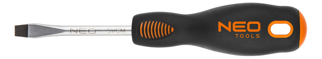 Wkrętak płaski NEO (nr ref. 04-001) o wymiarach 6.5 x 38 mm. Grot wkrętaka wykonany jest z wyjątkowo wytrzymałej stali S2. Końcówka robocza grota została poddana obróbce cieplnej, dzięki czemu uzyskano odpowiednią twardość i odporność na zgięcia 56 HRC. Wkrętak posiada magnetyczną końcówkę. Trójgraniasty kształt uchwytu z wyprofilowanym oparciem dla kciuka zmniejsza obciążenie dłoni podczas pracy i ułatwia uzyskanie optymalnego momentu obrotowego. Dwumateriałowy uchwyt zapobiega ślizganiu się w dłoni, odporny jest na działanie chemikaliów, olejów i smarów. Jakość narzędzia potwierdzona certyfikatem TÜV i 25-letnią gwarancją producenta. Marka NEO spełnia oczekiwania profesjonalistów.