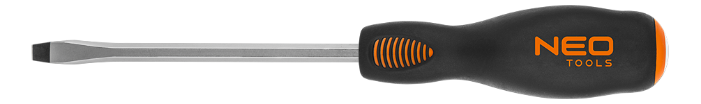 Wkrętak płaski do pobijania NEO (nr ref. 04-019) o wymiarach 6.5 x 125 mm. Specjalnie wzmocniony grot wkrętaka wykonany jest z wyjątkowo wytrzymałej stali S2. Końcówka robocza grota została poddana obróbce cieplnej, dzięki czemu uzyskano odpowiednią twardość i odporność na zgięcia 56 HRC. Wkrętak posiada magnetyczną końcówkę i uchwyt do pobijania. Trójgraniasty kształt uchwytu z wyprofilowanym oparciem dla kciuka zmniejsza obciążenie dłoni podczas pracy i ułatwia uzyskanie optymalnego momentu obrotowego. Dwumateriałowy uchwyt zapobiega ślizganiu się w dłoni, odporny jest na działanie chemikaliów, olejów i smarów. Jakość narzędzia potwierdzona certyfikatem TÜV i 25-letnią gwarancją producenta. Marka NEO spełnia oczekiwania profesjonalistów.