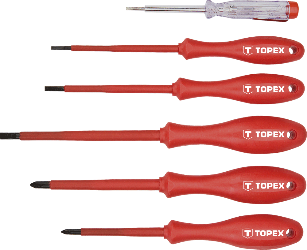 Zestaw wkrętaków TOPEX (nr ref. 39D155) przeznaczonych do prac pod napięciem do 1000V. Każdy z pięciu wkrętaków wykonany z wysokiej jakości stali chromowo-molibdenowej, izolowany. Dodatkowo w komplecie próbnik instalacji elektrycznej 125 - 250V. Wyprofilowana rękojeść prawidłowo leży w dłoni, co podnosi komfort pracy. Marka TOPEX skierowana jest do majsterkowiczów.