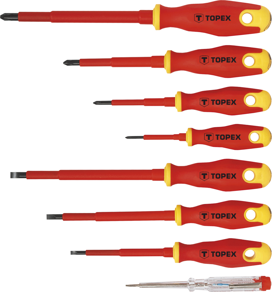Zestaw wkrętaków 1000V TOPEX (nr ref. 39D674) przeznaczonych do prac pod napięciem do 1000V. Każdy z siedmiu wkrętaków wykonany z wysokiej jakości stali chromowo-wanadowej, izolowany. Dodatkowo w komplecie próbnik instalacji elektrycznej 125 - 250V. Ergonomiczny uchwyt z tworzywa sztucznego pokryty antypoślizgowym materiałem zapewnia komfort i bezpieczeństwo podczas pracy. Marka TOPEX skierowana jest do majsterkowiczów.