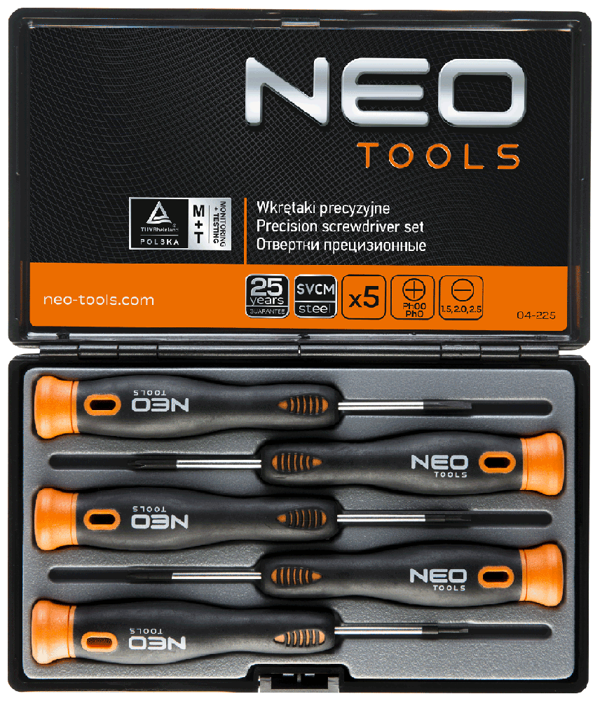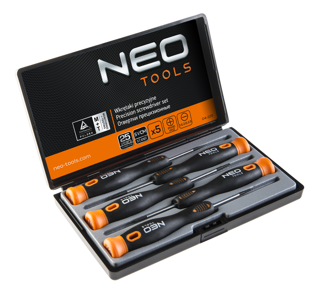 Zestaw wkrętaków precyzyjnych NEO (nr ref. 04-225) zawiera 5 wkrętaków: płaskich i krzyżowych. Grot wkrętaka wykonany jest z wyjątkowo wytrzymałej stali chromowo-molibdenowej. Końcówka robocza grota została poddana obróbce cieplnej, dzięki czemu uzyskano odpowiednią twardość i odporność na zgięcia. Wkrętak posiada magnetyczną końcówkę. Obrotowa nasadka w rękojeści umożliwia precyzyjnie dokręcanie śrub. Dwumateriałowy uchwyt odporny jest na działanie chemikaliów, olejów i smarów. Jakość narzędzia potwierdzona certyfikatem TÜV i 25-letnią gwarancją producenta. Marka NEO spełnia oczekiwania profesjonalistów.