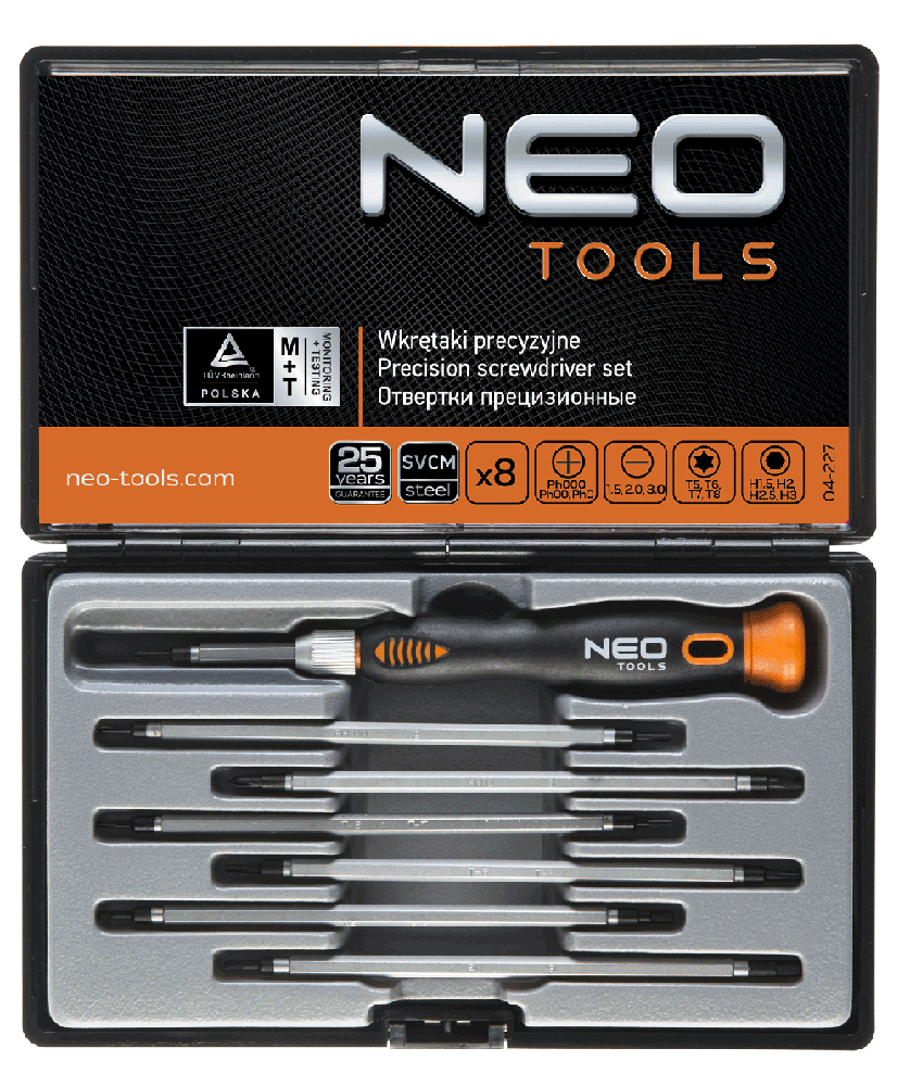 Zestaw wkrętaków precyzyjnych NEO (nr ref. 04-227) zawiera uchwyt i 7 dwustronnych bitów 120 mm (płaskich, krzyżowych, Torx i sześciokątnych). Magnetyczne końcówki wykonane są z wyjątkowo wytrzymałej stali chromowo-molibdenowej. Obrotowa nasadka w rękojeści umożliwia precyzyjnie dokręcanie śrub. Uchwyt dwumateriałowy odporny jest na działanie chemikaliów, olejów i smarów. Jakość narzędzia potwierdzona certyfikatem TÜV i 25-letnią gwarancją producenta. Marka NEO spełnia oczekiwania profesjonalistów.