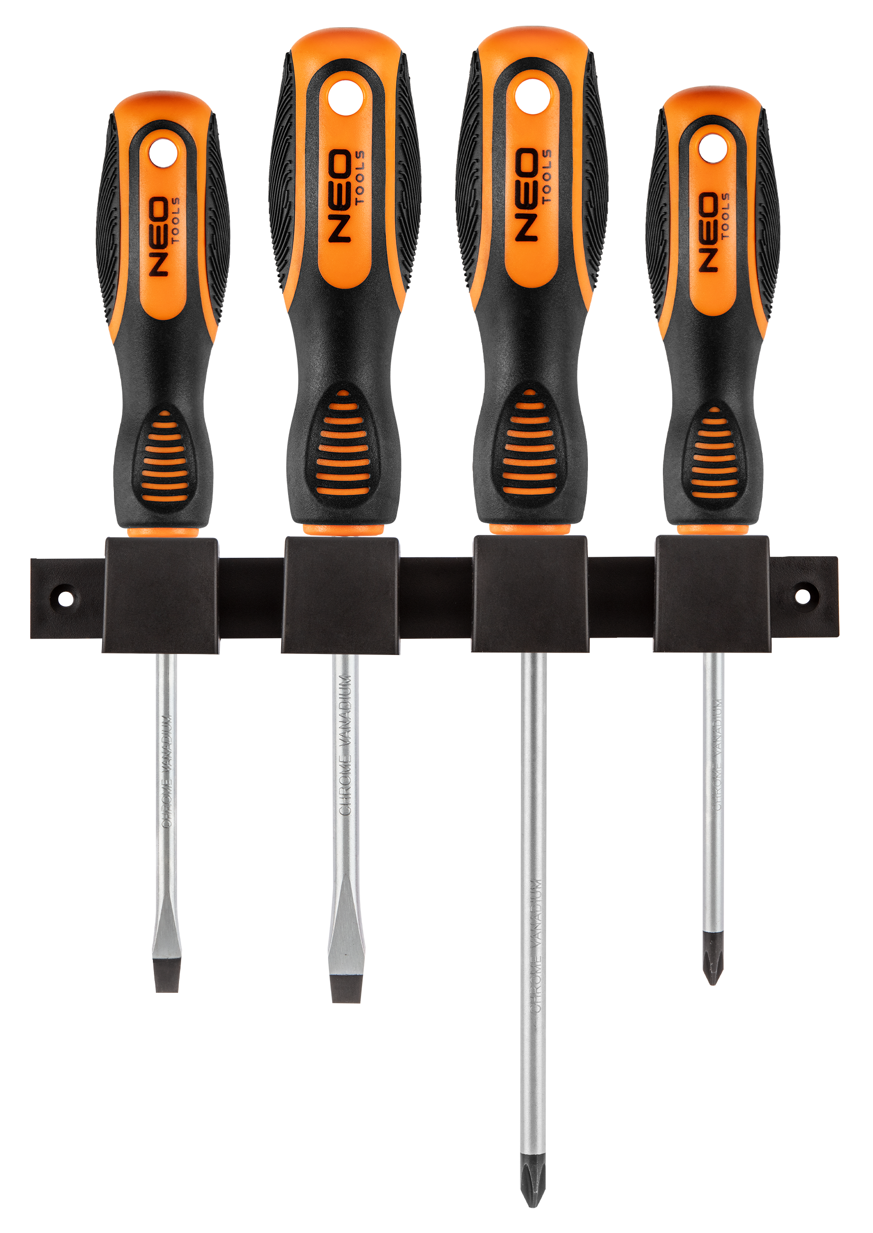 Zestaw wkrętaków NEO (nr ref. 04-191) zawiera 4 wkrętaków: płaskie i krzyżowe. Grot wkrętaka wykonany jest z wytrzymałej stali CrV. Wkrętak posiada magnetyczną końcówkę. Trójgraniasty kształt uchwytu z wyprofilowanym oparciem dla kciuka zmniejsza obciążenie dłoni podczas pracy i ułatwia uzyskanie optymalnego momentu obrotowego. Uchwyt dwumateriałowy zapobiega ślizganiu się w dłoni, odporny jest na działanie chemikaliów, olejów i smarów. aby Marka NEO spełnia oczekiwania profesjonalistów.