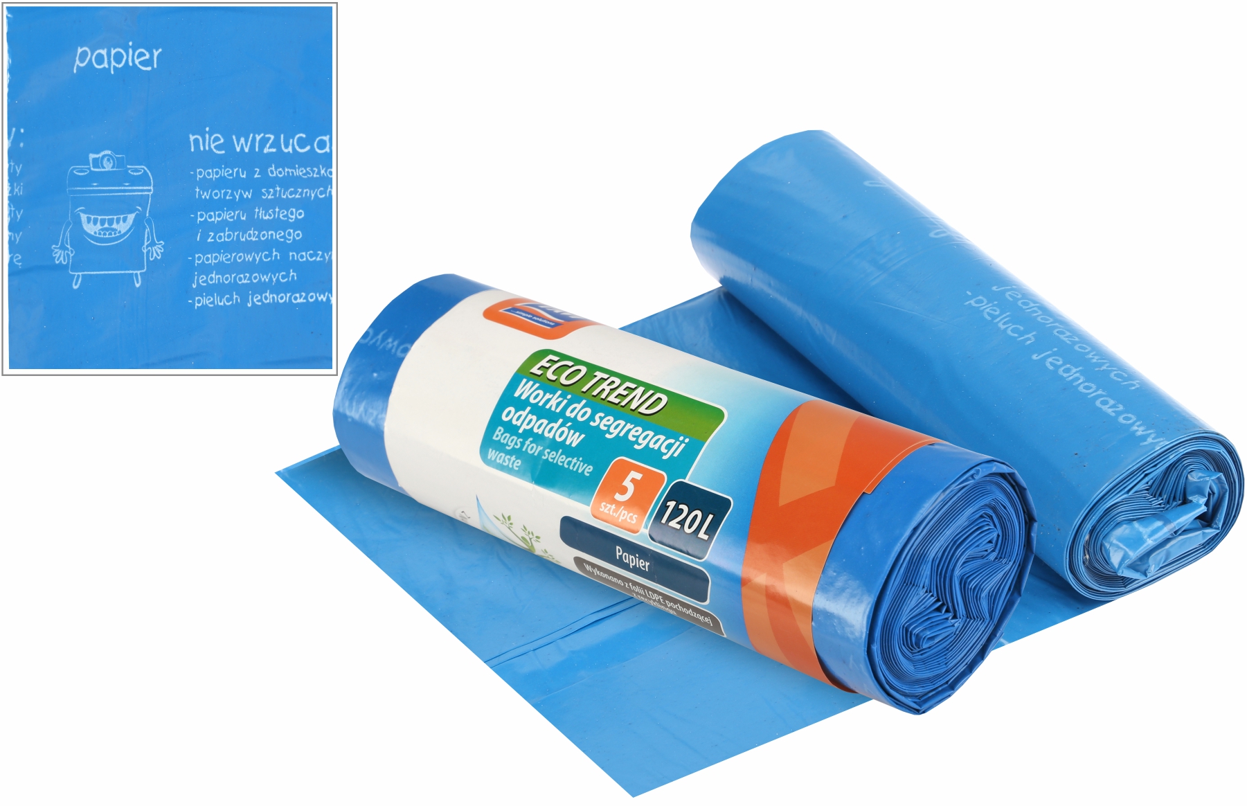 Worki na papier Eco Trend 120 L 5 szt. niebieskie RAVI są przeznaczone do selektywnej zbiórki odpadów w domu, biurze czy budynkach użyteczności publicznej. Do worków nie należy wrzucać papieru z domieszką tworzyw sztucznych, papieru tłustego i zabrudzonego, papierowych naczyń jednorazowych oraz pieluch. Wykonane z wysokiej jakości folii LDPE charakteryzują się dużą wytrzymałością oraz optymalną pojemnością aż 120 litrów. Główne cechy charakterystyczne worków na papier Eco Trend 120 L 5 szt. niebieskich RAVI to zwłaszcza: