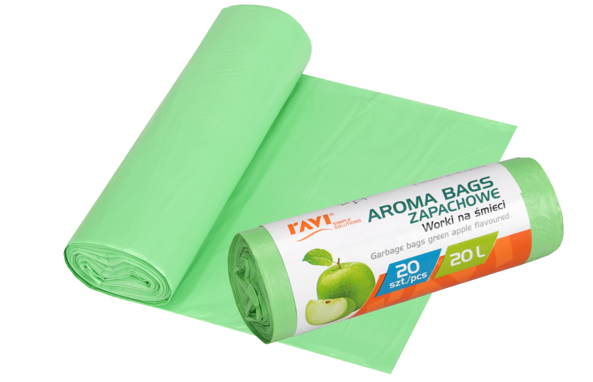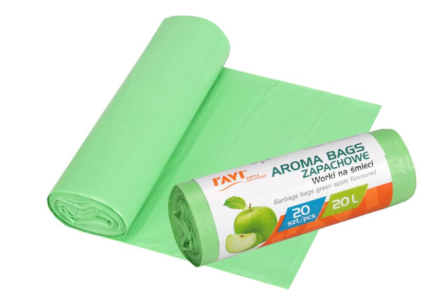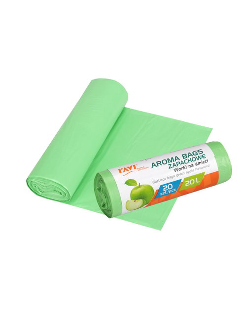 Worki na śmieci o zapachu zielonego jabłuszka oferowane przez markę Ravi - Simple Solutions sprzedawane są w ilości 20 sztuk po 20 l każdy. Zapewniają wygodne segregowanie śmieci. Wykazują się bardzo dużą wytrzymałością na uszkodzenia. Worki na śmieci ułatwiają przechowywanie i transport ciężkich śmieci. Dzięki temu, że posiadają zapach zielonego jabłuszka, skutecznie niwelują nieprzyjemne zapachy. Dzięki wykonaniu z wysokiej jakości folii, są niezawodne w zadbaniu o czystość.