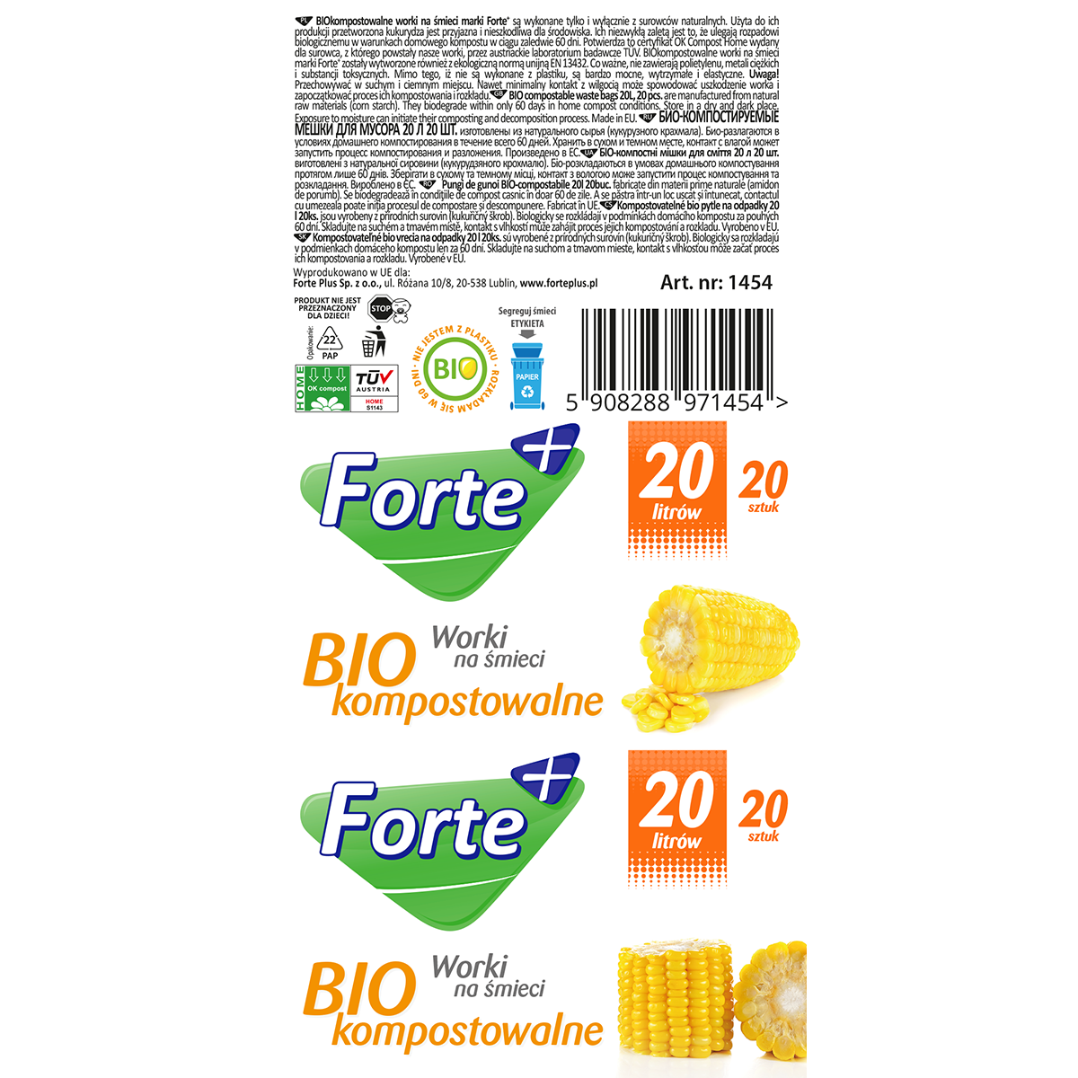 BIOkompostowalne worki na śmieci marki Forte+ są wykonane tylko i wyłącznie z surowców naturalnych. Użyta do ich produkcji przetworzona kukurydza jest przyjazna i nieszkodliwa dla środowiska. Ich niezwykłą zaletą jest to, że ulegają rozpadowi biologicznemu w warunkach domowego kompostu w ciągu zaledwie 60 dni. Potwierdza to certyfikat OK Compost Home wydany dla surowca, z którego powstały nasze worki, przez austriackie laboratorium badawcze TÜV. BIOkompostowalne worki na śmieci marki Forte+ zostały wytworzone również z ekologiczną normą unijną EN 13432. Co ważne, nie zawierają polietylenu, metali ciężkich i substancji toksycznych. Mimo tego, iż nie są wykonane z plastiku, są bardzo mocne, wytrzymałe i elastyczne.