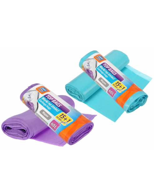 Wyjątkowo wygodne, wiązane worki na śmieci wykonane z folii LD/HD o pojemności 60l. W nawoju rolki znajduje się 16 sztuk.