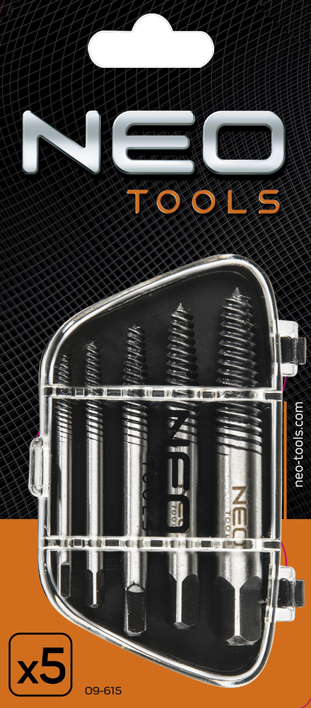 Wykrętaki do zerwanych śrub NEO (nr ref. 09-615) Wykonane z wysokiej jakości stali chromowo - molibdenowej, zapewniającej długoletnią trwałość. W skład zestawu wchodzi 5 szt. wkrętaków w typowych rozmiarach, do śrub: M3-6, M6-8, M8-11, M11-14, M14-18 .Całość dostarczona jest w praktycznym etui z przeźroczystym wieczkiem. Jakość narzędzia potwierdzona certyfikatem TÜV i 25-letnią gwarancją producenta. Marka NEO spełnia oczekiwania profesjonalistów.