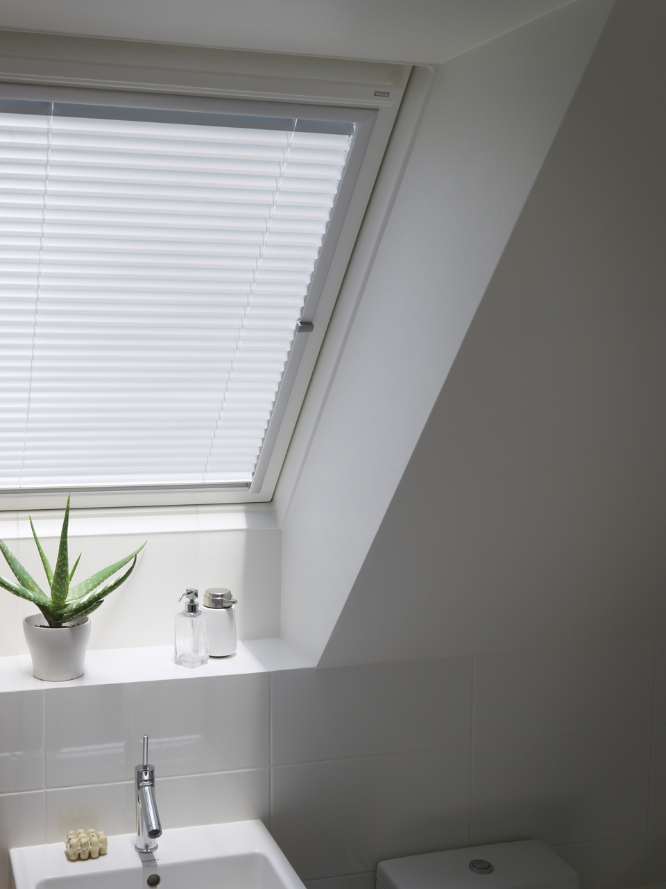 Żaluzje VELUX PAL doskonale sprawdzają się w łazienkach i kuchniach o wysokim stopniu wilgotności. Dzięki unikatowej konstrukcji wyeliminowano nieestetyczne, zwisające sznurki. Wystarczy nachylić listwy w dowolnym kierunku, aby wyregulować ilość wpadającego światła lub zadbać o prywatność.