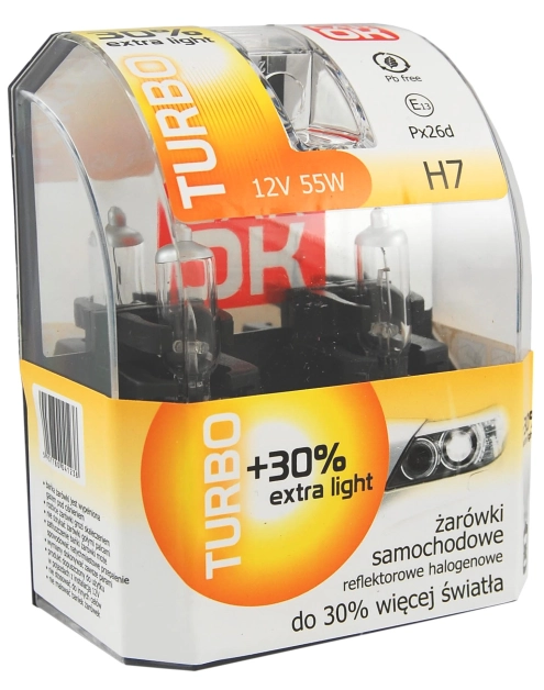 Nowoczesna, wydajna żarówka halogenowa H7 z serii Turbo CARK OK sprawdzi się jako skuteczne, energooszczędne rozwiązanie do samochodu.