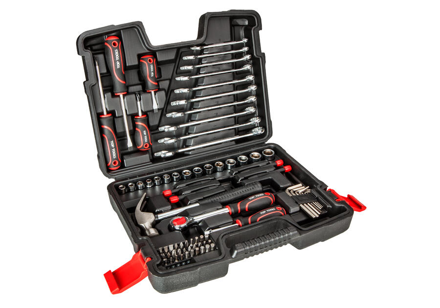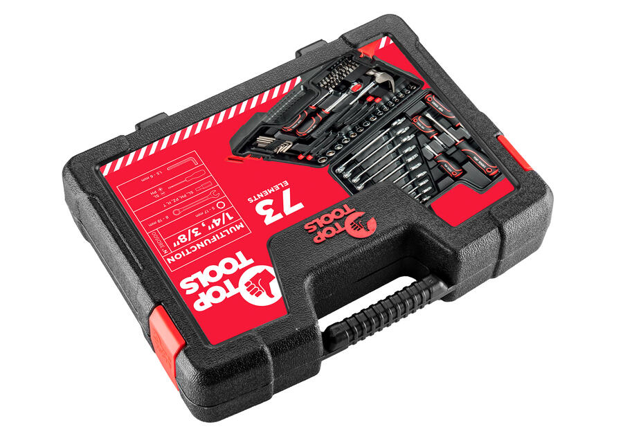 Podstawowy zestaw narzędziowy Top Tools (nr ref. 38D500) jest przeznaczony do wszystkich najpopularniejszych prac w domu. Składa się z 73 elementów w rozmiarach 1 oraz 3/8 . Zestaw zawiera pełen pakiet nasadek sześciokątnych w dwóch rozmiarach, grzechotk