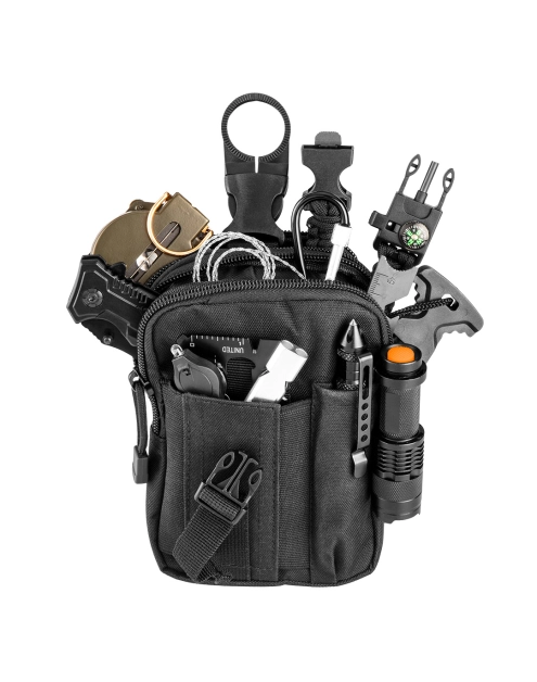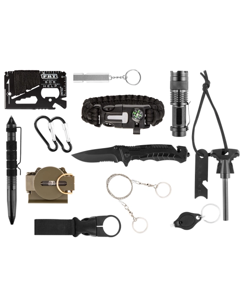Zestaw survivalowy 14 w 1 w pouchu zestaw zawiera krzesiwo z otwieraczem do butelek, nóż z ostrzem składanym, latarka, bransoletka przetrwania (lina paracord, krzesiwo, kompas), gwizdek, karta wielofunkcyjna (wykonana ze stali nierdzewnej, zawiera otwieracz do butelek, otwieracz do puszek, piłę, klucz oczkowy w rozmiarach 4, 5, 6, 7 mm, miarka, wkrętak płaski, nóż, line paracord), piła drutowa, długopis taktyczny, klips do zawieszenia butelki, kompas rozkładany, karabińczyka 2 sztuki, mini latarka z breloczkiem, torba z klamrami do paska.