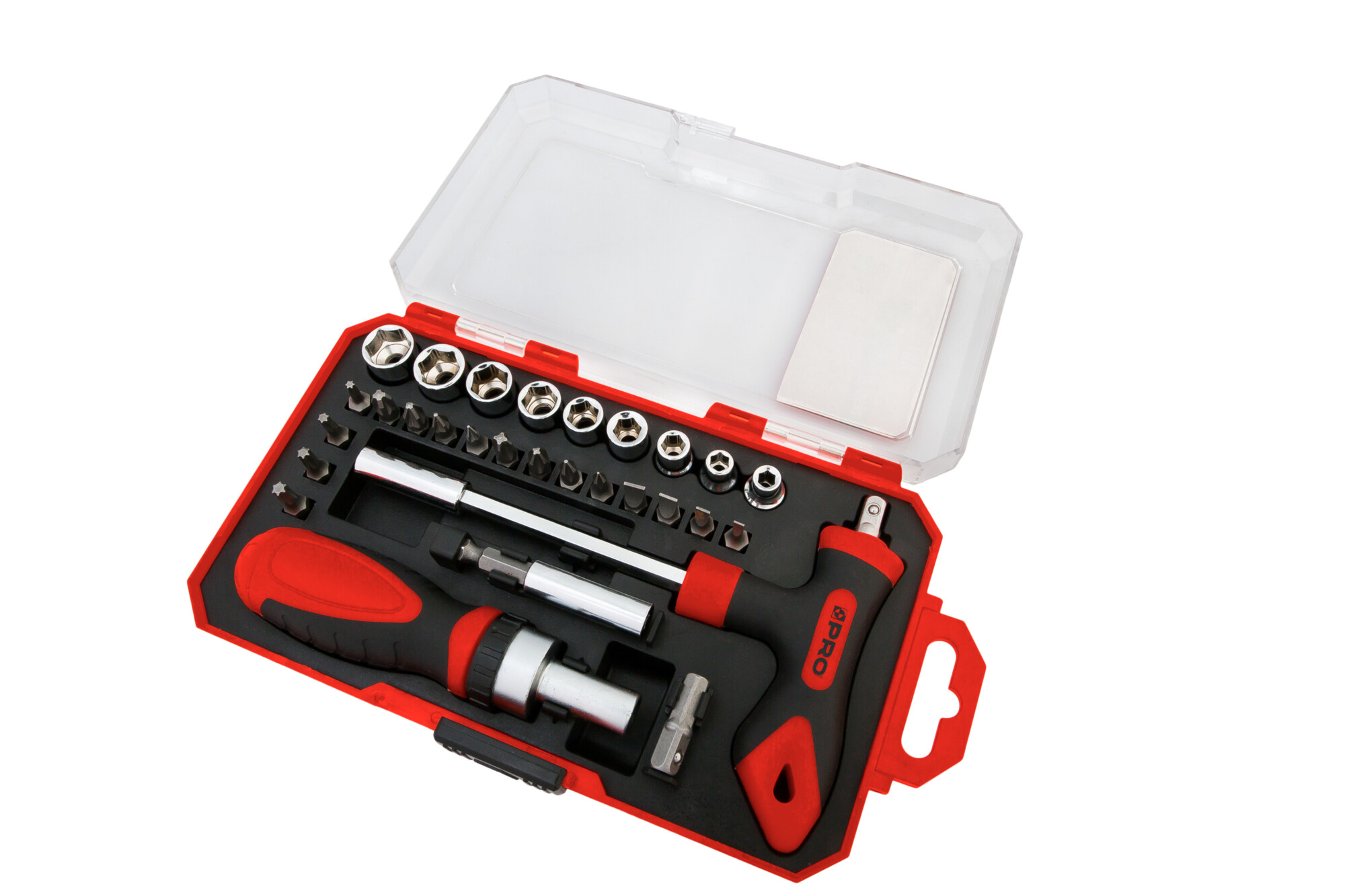 • T-kształtny uchwyt na bity i nasadki - 1 szt.; Wkrętak z grzechotką - 1 szt.; Uchwyt magnetyczny do bitów - 1 szt.; Adapter do nasadek (25 mm) - 1 szt.; Bity (6,35 × 25 mm) - 16 szt.: 3 mm, 4 mm, 5 mm, 6 mm, PH0, PH1, PH2, PH3, PZ0, PZ1, PZ2, PZ3, T10, T15, T20, T25; Nasadki 1/4” - 9 szt.: 5 mm, 6 mm, 7 mm, 8 mm, 9 mm, 10 mm, 11 mm, 12 mm, 13 mm.