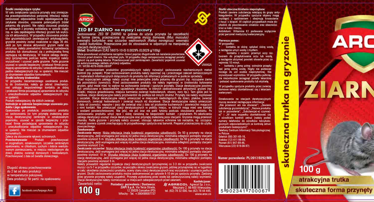 ZED BF ZIARNO to gotowa do użycia przynęta (w saszetkach) w formie ziarna, przeznaczona do zwalczania myszy domowej (Mus musculus) wewnątrz budynków oraz szczurów wędrownych (Rattus norvegicus) wewnątrz i wokół budynków. Przeznaczona jest do stosowania w odpornych na manipulację stacjach deratyzacyjnych.