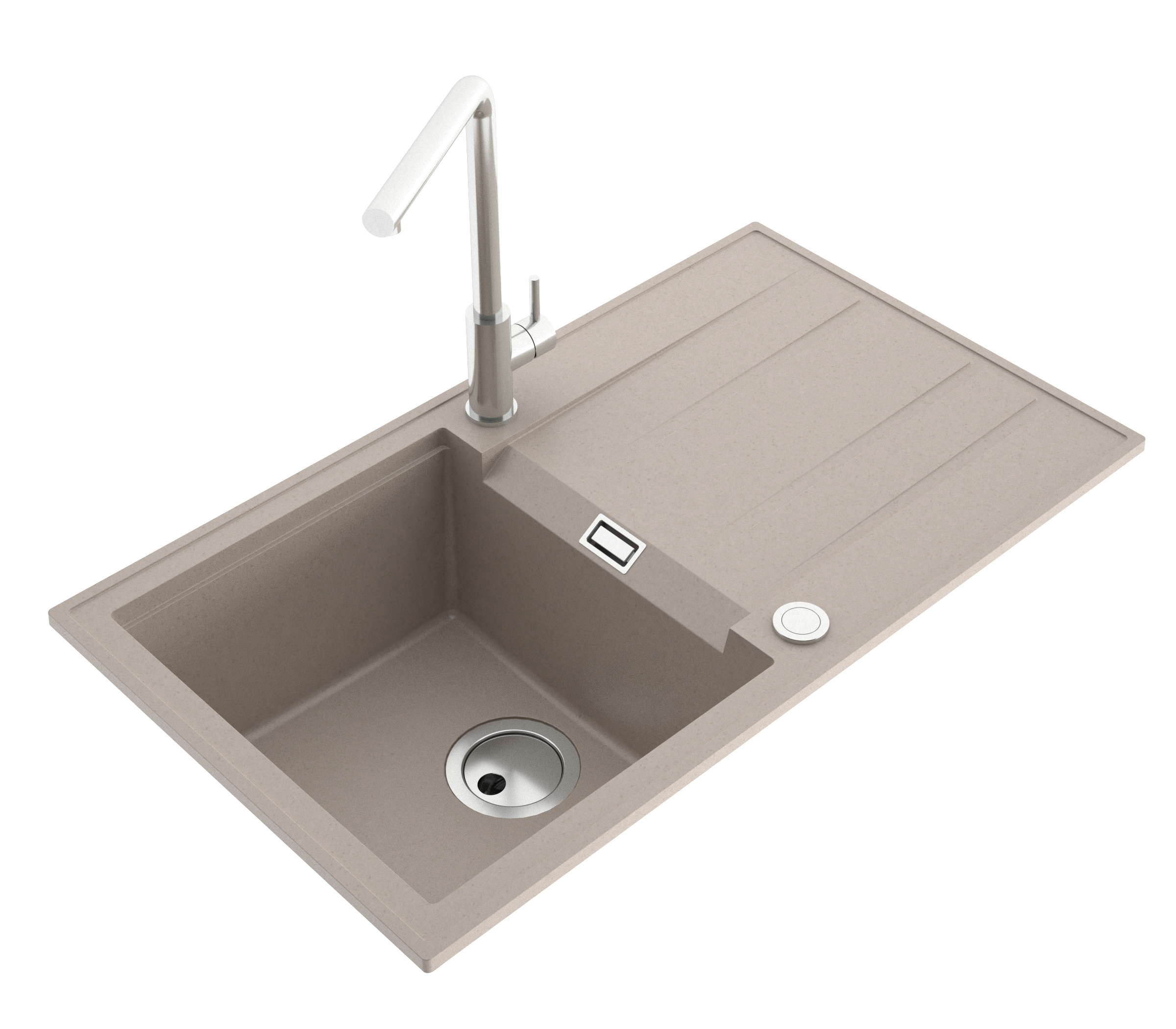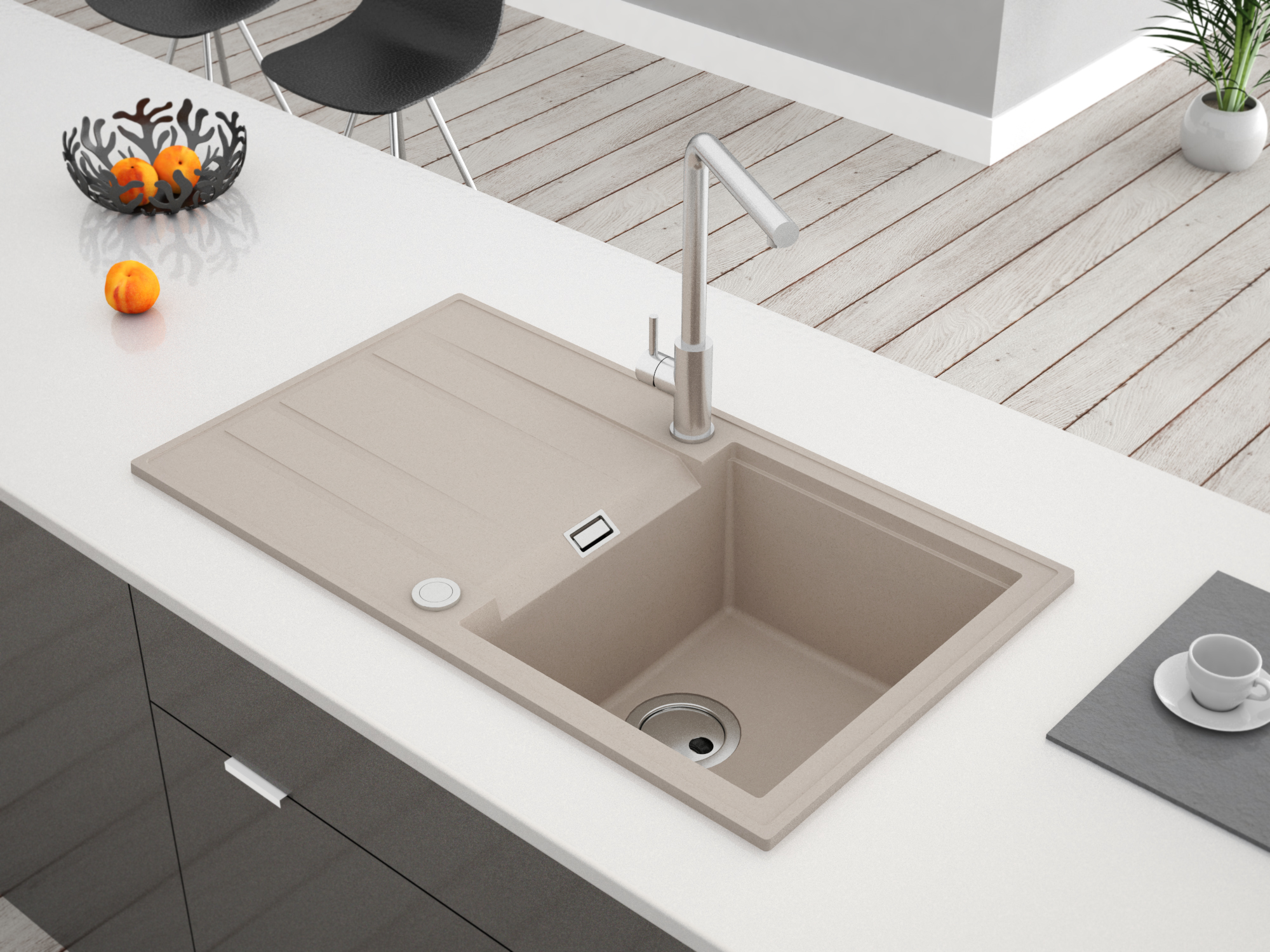 W komplecie bateria Elite "F" w kolorze zlewozmywaka i nowoczesny syfon automatyczny z estetyczną maskownicą odpływu - to ekskluzywne rozwiązanie dla wymagających klientów. Wystarczy użyć przycisku na górnej krawędzi ściany komory, aby opróżnić ją z wody, bez konieczności moczenia ręki.